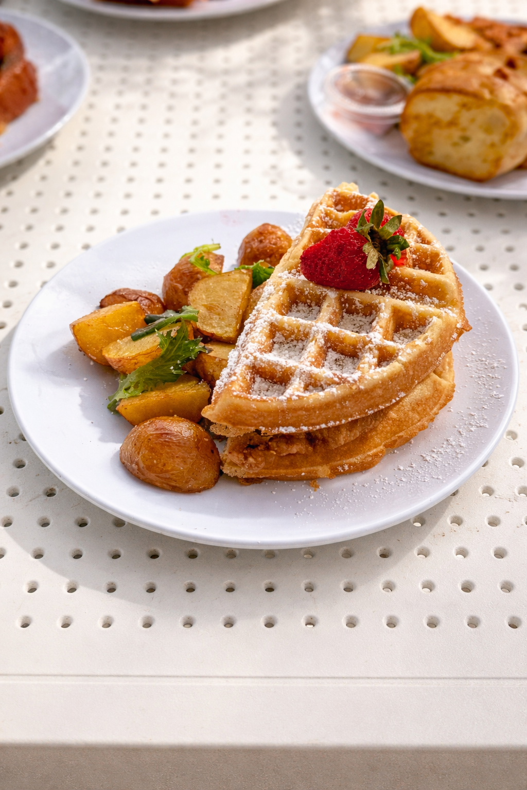 Crispy chicken served with waffles, with maple sauce and sauteed potatoes.